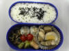 豚の角煮と卵、焼売、ウィンナ、サツマイモの甘露煮、ひじきと厚揚げの煮物、ごまのかかったご飯です。