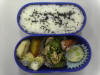 チーズの豚肉と湯葉巻き、大学芋、アンパンマンポテト、豚肉とピーマンの炒め物、枝豆入りさつま揚げ、ソーセージ、ごまを振り掛けたご飯です。