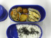 チーズ巻き、焼売、鶏つくね焼き、卵焼き、カボチャの煮物、あめ芋、アンパンマンポテト、ごまのかかったご飯です。