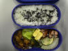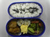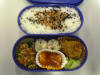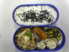 から揚げ、はやと瓜の炒め物、卵焼き、枝豆入りテンプラ、ソーセージ、野菜炒め、ごまのかかったご飯です。