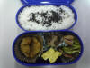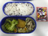 から揚げ、豚肉のピリ辛炒め、、ウィンナ、卵焼き、ブロッコリーとベーコンの炒め物、ゴマのかかったご飯です。