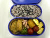 サーモンのてんぷら、とんかつゴマソース入り、卵焼き、ピーマン炒め、プチトマト、ウィンナ、赤米入りご飯です。