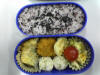 ミニメンチカツ、えびチリソース、ウィンナ、海苔付チキンカツ、春巻き、プチトマト、ごまのかかったご飯です。