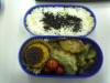鶏肉のトマトにイタリア風、海苔の付とんかつ、サツマイモのバター煮、ウィンナ、プチトマト、ごまのかかったご飯です。